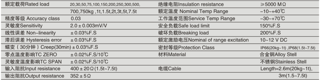 柯力PST系列稱重傳感器技術(shù)參數(shù)