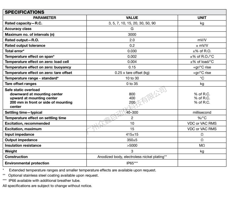 五、美國特迪亞 9010-90kg獨立稱重模塊技術(shù)參數(shù)