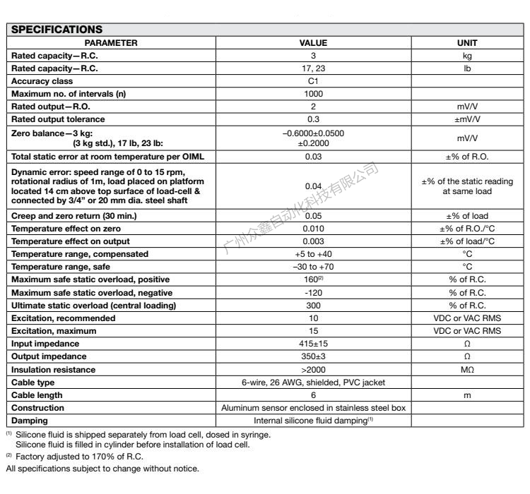 五、美國(guó)特迪亞 1430-23lbs稱重傳感器技術(shù)參數(shù)