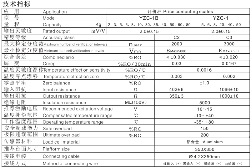 廣州電測傳感器YZC-1B系列產(chǎn)品參數(shù):