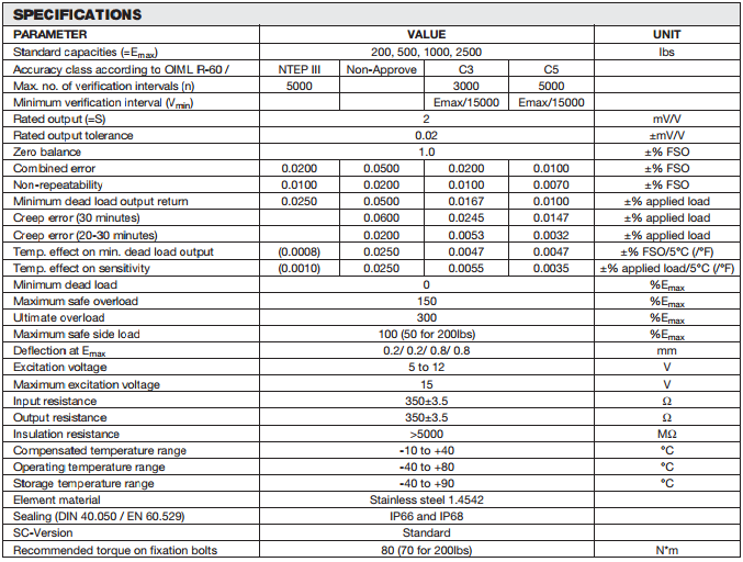 美國Vishay Revere稱重傳感器9102系列產(chǎn)品參數(shù):