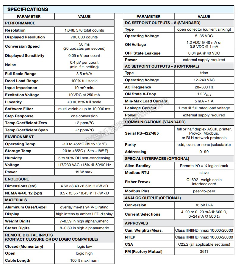 (2)LCm-200s與所有應(yīng)變式稱重傳感器兼容,并可與任何基于PLC、PC或DCS的監(jiān)控系統(tǒng)輕松連接。高性能“專家”功能包括即插即用快速校準(zhǔn)、rateby-weight質(zhì)量流量測(cè)量、連續(xù)在線診斷和動(dòng)態(tài)數(shù)字過(guò)濾。過(guò)程控制選項(xiàng)提供高分辨率16位模擬輸出、8個(gè)固態(tài)設(shè)定點(diǎn)繼電器輸出和各種通信標(biāo)準(zhǔn)協(xié)議,如Allen-Bradley遠(yuǎn)程I/O、Modbus Plus、Modbus RTU和Fisher Provox。