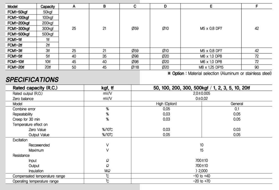 :FCM1-50kgf,F(xiàn)CM1-100kgf,F(xiàn)CM1-200kgf,F(xiàn)CM1-300kgf,F(xiàn)CM1-500kgf,F(xiàn)CM1-1tf,F(xiàn)CM1-2tf,F(xiàn)CM1-3tf,F(xiàn)CM1-5tf,F(xiàn)CM1-10tf,F(xiàn)CM1-20tf。韓國Fine FCH1-500kgf~500tf稱重傳感器是