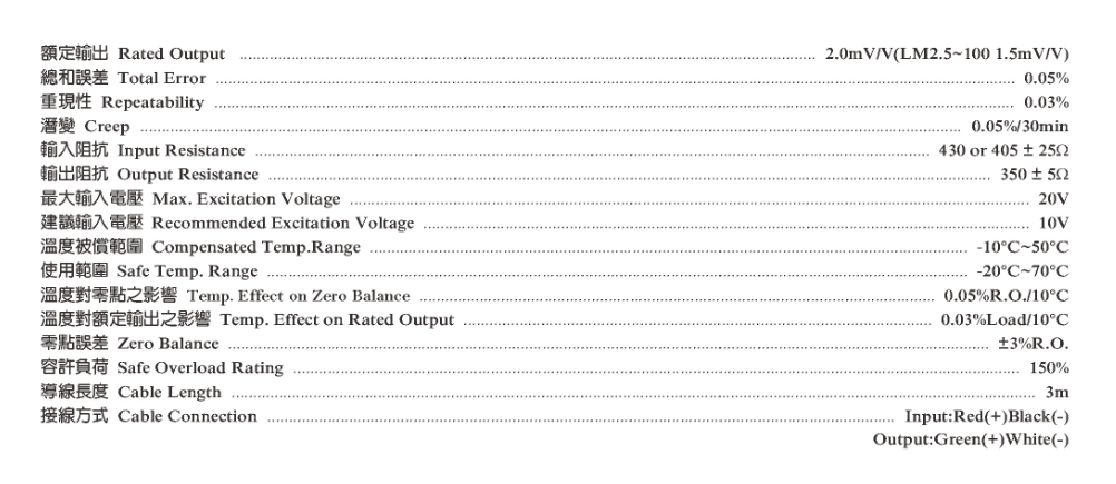 臺灣JIHSENSE S LOAD CELL規(guī)格參數(shù):