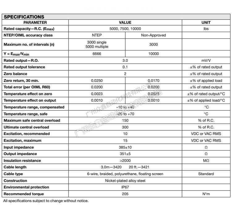 五、美國(guó)特迪亞 3420稱重傳感器產(chǎn)品技術(shù)參數(shù)