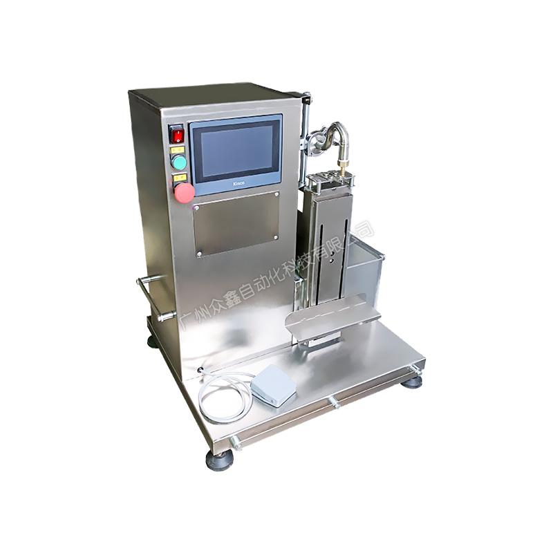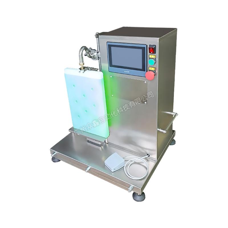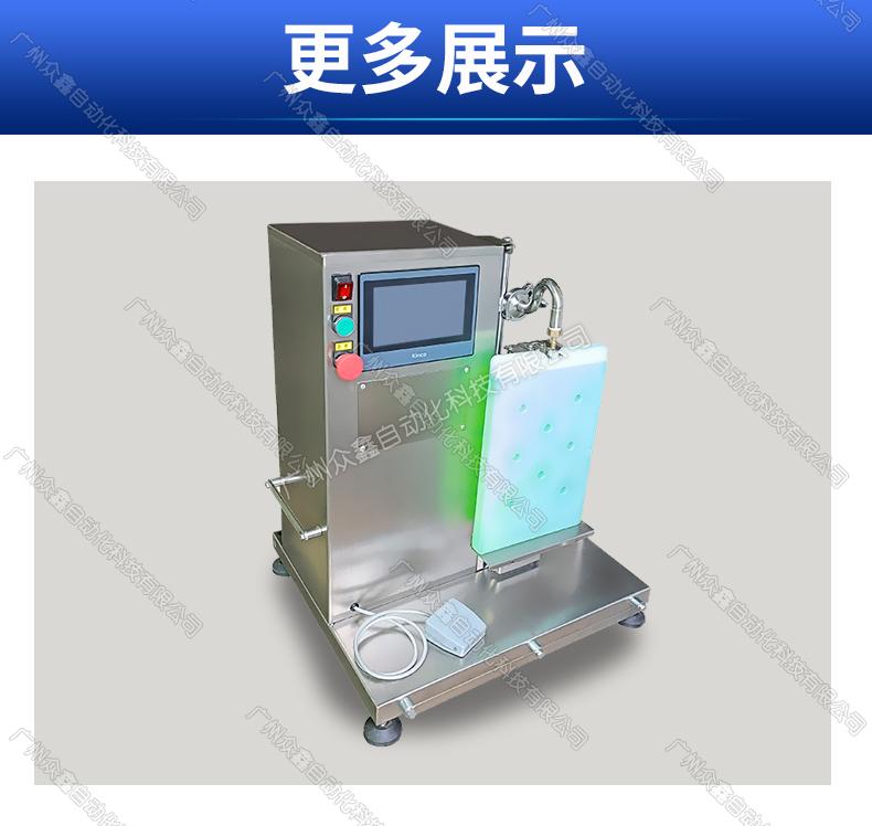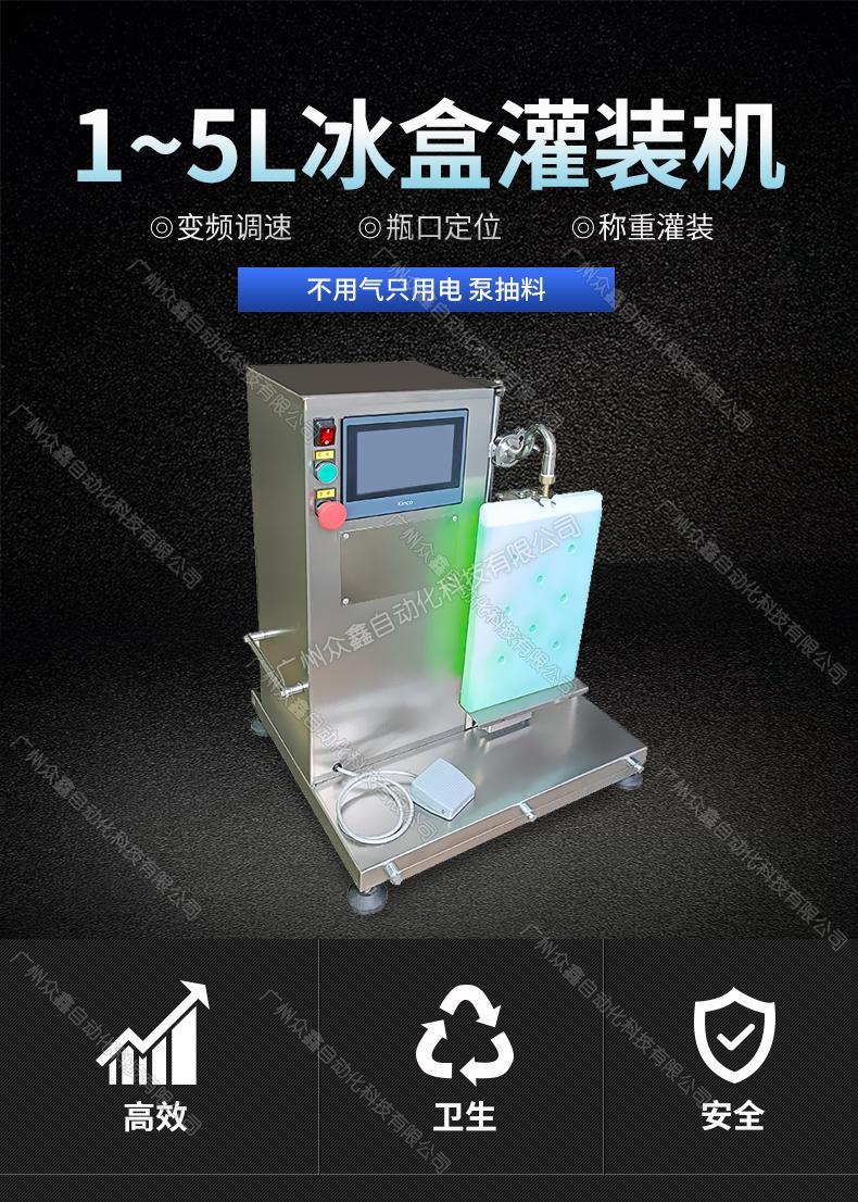純電泵直接抽料,不用壓縮空氣,變頻器控制泵的流速,先快后慢,稱重式灌裝。機(jī)器主體采用不銹鋼材質(zhì),灌裝容量1-5L,分裝為主。此型號機(jī)器可灌注小口徑冰晶盒、藍(lán) 冰、冰磚等。