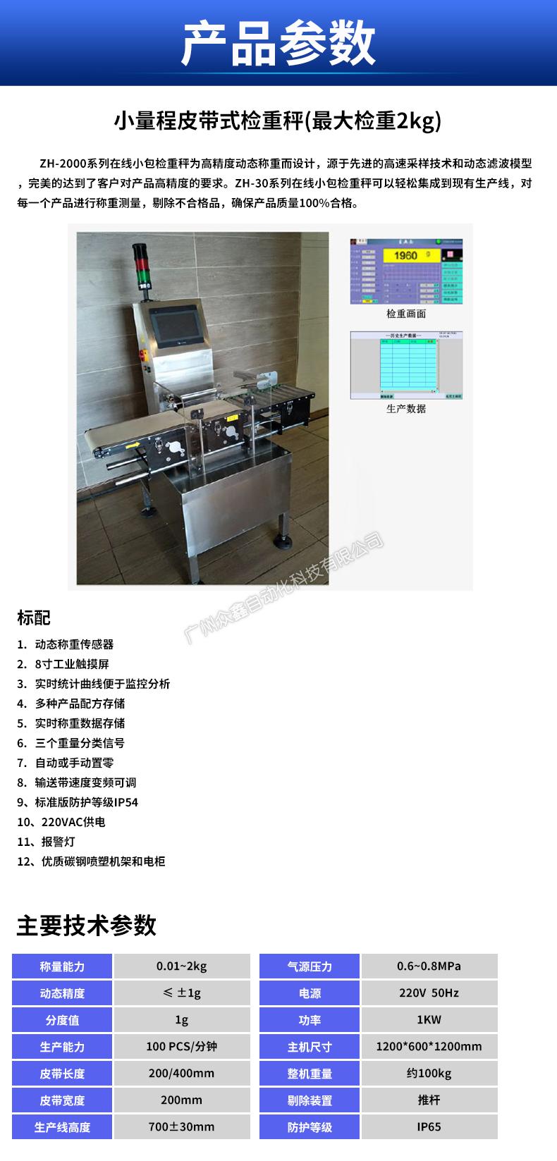 ZH-2000系列在線小包檢重秤為高精度動態(tài)稱重而設計,源于先進的高速采樣技術和動態(tài)濾波模型 ,完美的達到了客戶對產(chǎn)品高精度的要求。ZH-30系列在線小包檢重秤可以輕松集成到現(xiàn)有生產(chǎn)線,對 每一個產(chǎn)品進行稱重測量,剔除不合格品,確保產(chǎn)品質量100%合格。