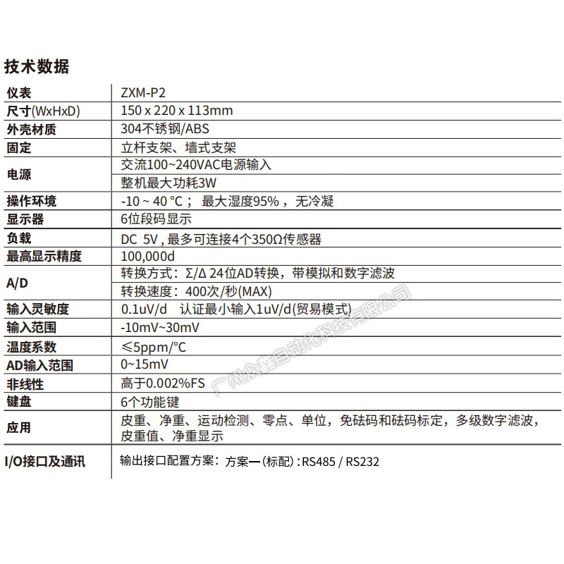 三、ZXM-P2過程稱重顯示控制器技術(shù)參數(shù)