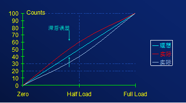 線性: 表示系統(tǒng)的實際輸出和理論直線的一致程度。如圖所示,當產生線性誤差時,系統(tǒng)在空載和滿載時的輸出是正確的,但這兩點 之間的輸入-輸出點和理想狀態(tài)不一致。線性誤差就是理論直線和實際輸出曲線之間的最大差值。