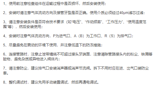 3、電磁閥安裝后,管道中不得有反向壓差。并需通電數(shù)次,使之適溫后方可正式投入使用;